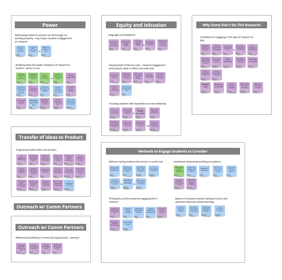We spent time talking to subject matter experts who focused on engaging, testing, and co-designing with elementary aged students. Their expertise in this field with younger students allowed us to identify established practices for co-designing with young kids.