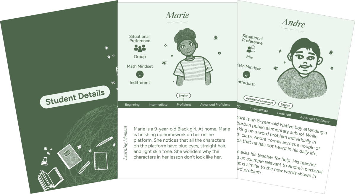 To ensure we started on the right track, we interviewed classroom teachers (with a focus on math teachers), school administrators, and caregivers of students in 3rd through 6th grades. We learned about the context of students including the needs that they see of the priority student groups and how best to engage students this age.